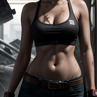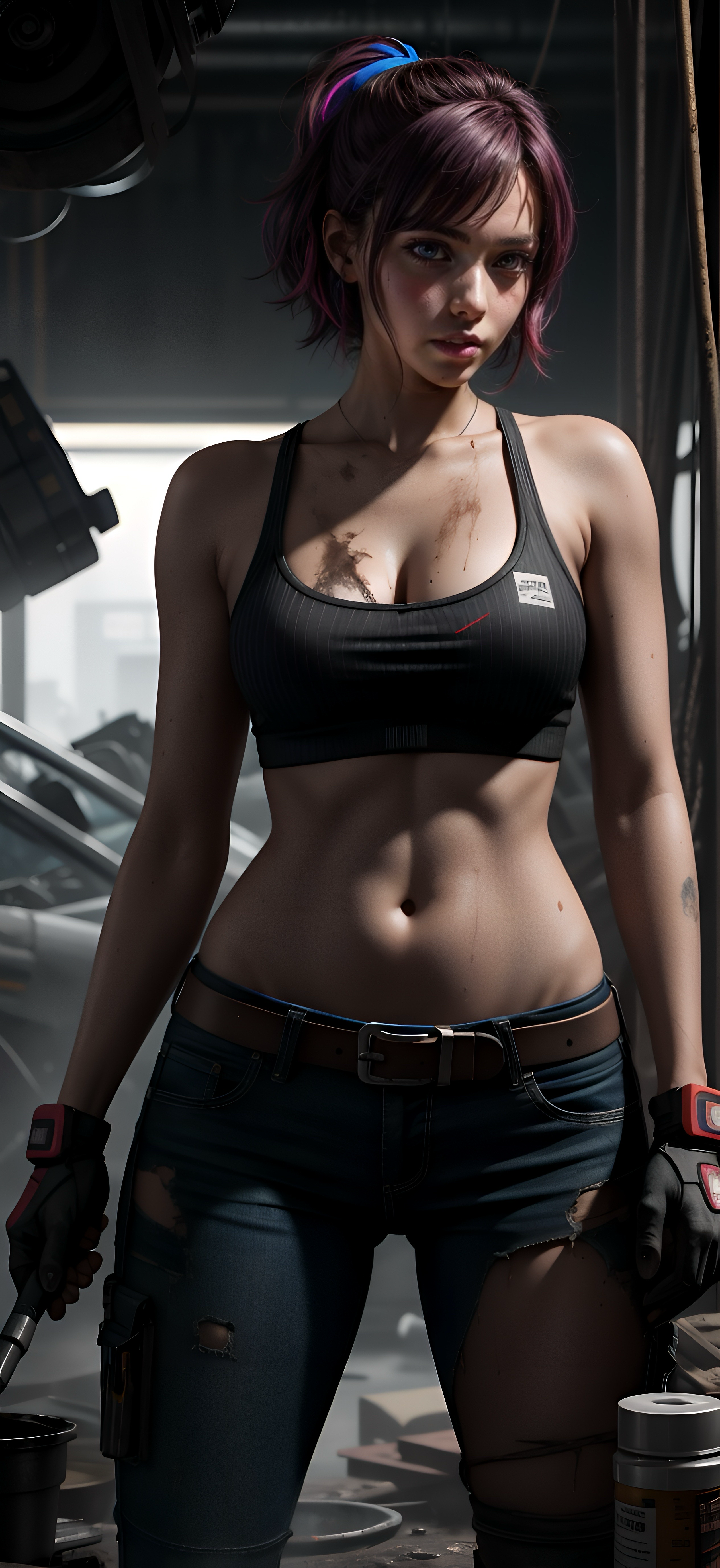 A young female mechanic stands in her workshop, her jeans torn and her skin marked with smudges of oil. The tools and parts scattered around suggest a day filled with hard work and determination. Despite her messy appearance, she radiates confidence, embodying the grit and strength of her profession.