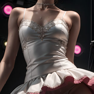 A delicate ballerina glides gracefully across the stage, her petite figure adorned in a white, intricately detailed bodice that sparkles under the warm glow of the stage lights. The soft pink layers of her tutu flutter with every elegant movement, creating a mesmerizing contrast to the stark black background of the theater. Strands of her hair, styled into a neat bun, cling to her glistening forehead, and her skin shines faintly from the effort of her performance.