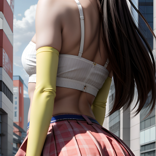 In the heart of Tokyo, a joung Japanese girl strolls through the vibrant streets. Her playful outfit, a realy short plaid skirt showing a hint of her booty and bold yellow gloves, turns heads wherever she goes. With a knowing smile, she seems fully aware of the attention she’s drawing, suggesting there’s more behind her stylish choices than meets the eye.