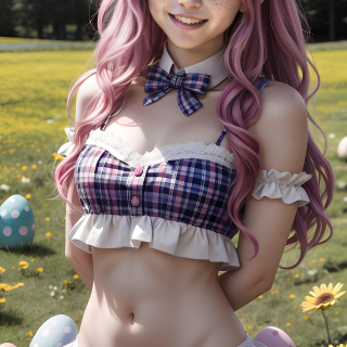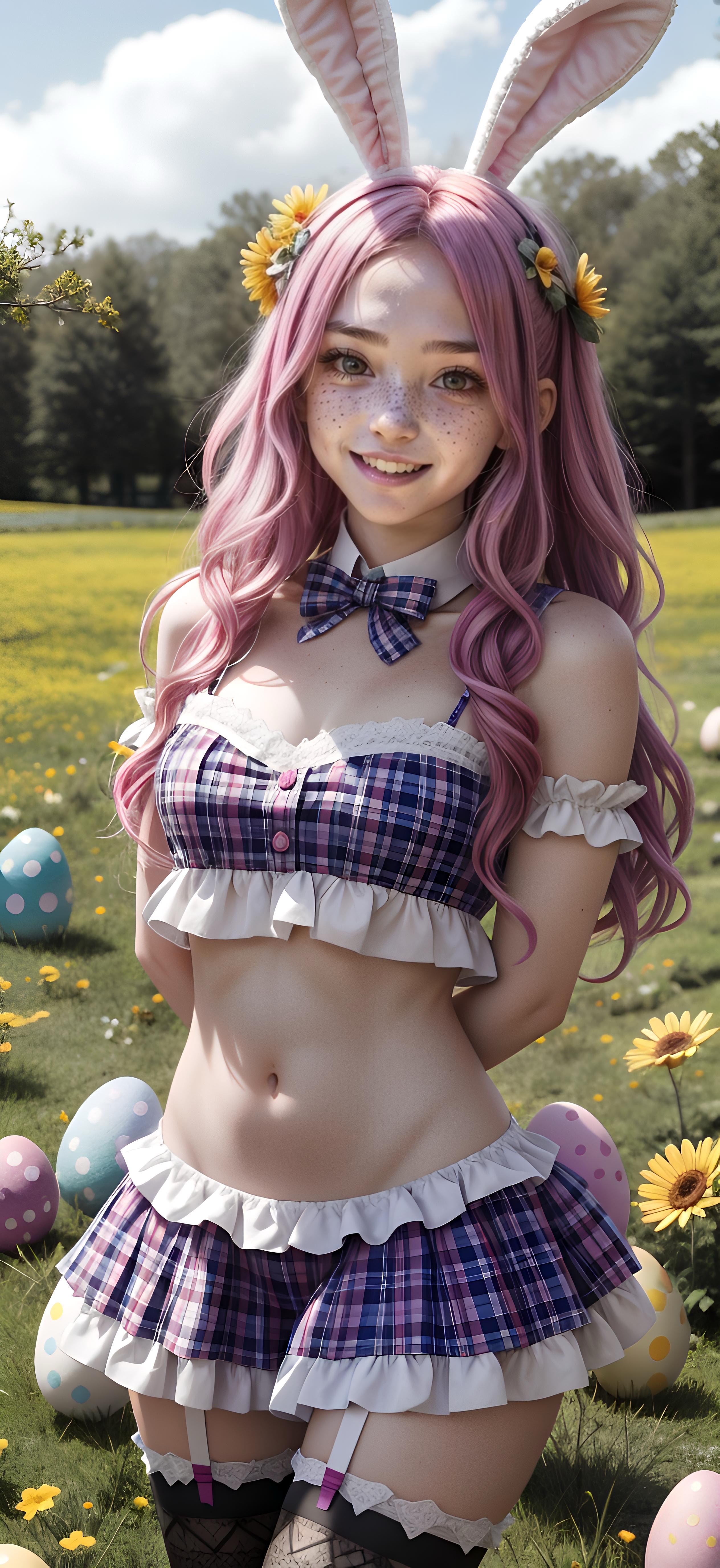 In a sunlit meadow bursting with spring flowers and pastel Easter eggs, she hops into the season with a smile as sweet as sunshine. Her lilac curls bounce playfully beneath soft bunny ears, while her plaid outfit flutters in the breeze. She’s our new Easter Bunny... cheerful, mischievous, and ready to brighten any screen she graces.
