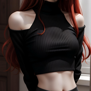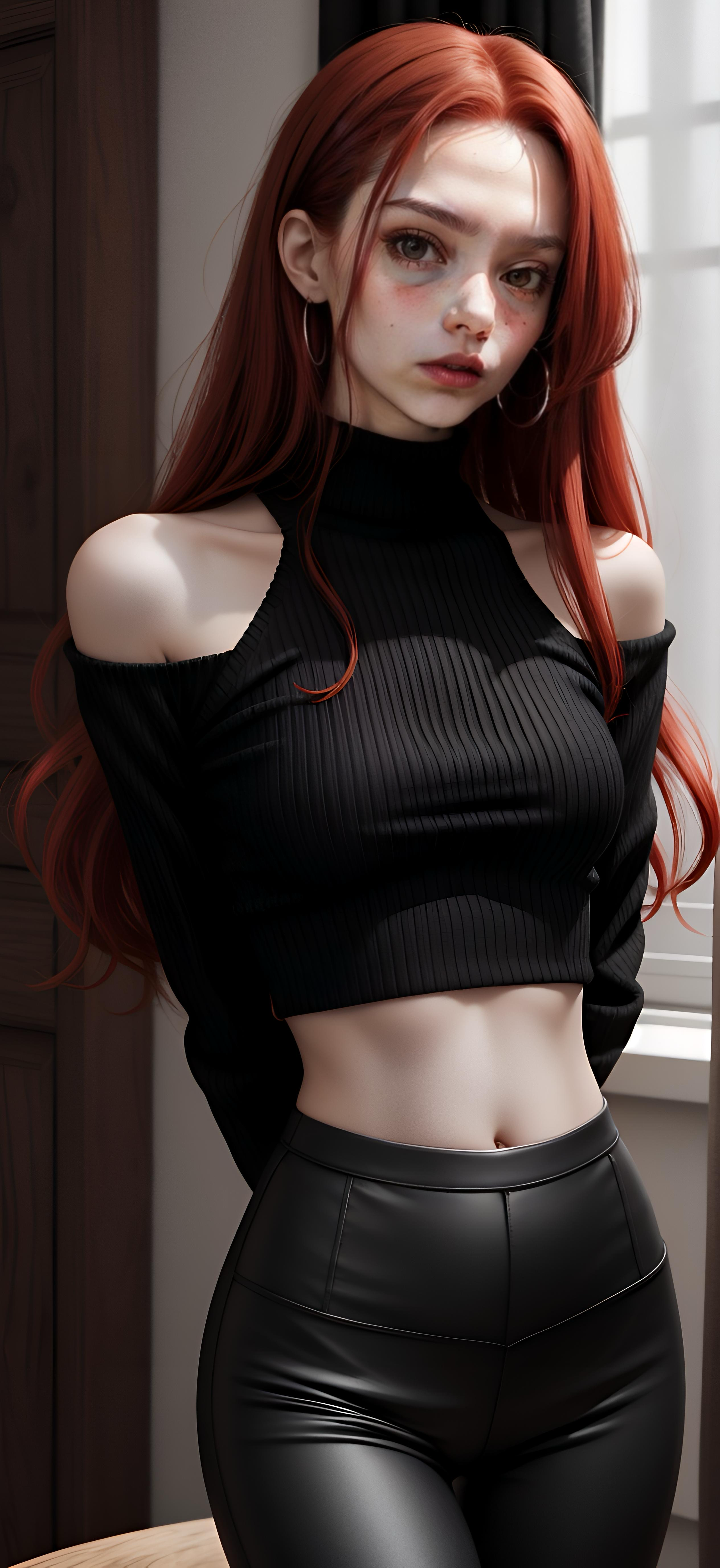In the stillness of a quiet morning, she stood by the window like a secret waiting to be whispered. Her fiery red hair cascaded like liquid flame over her shoulders, catching the soft light in strands of copper and gold. The contrast of her porcelain skin and the sleek black outfit only magnified her presence. Petite slender and delicate, yet undeniably sensual in every graceful curve. There was something unspoken in her gaze, something between innocence and intensity, like a poem left unfinished. This was not just a girl. This was a moment. A breath held. A storm contained in velvet silence.