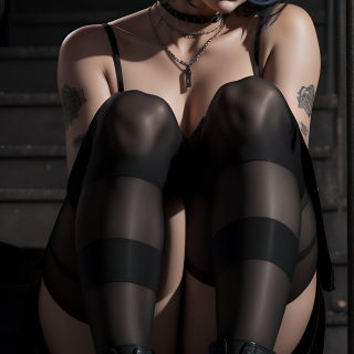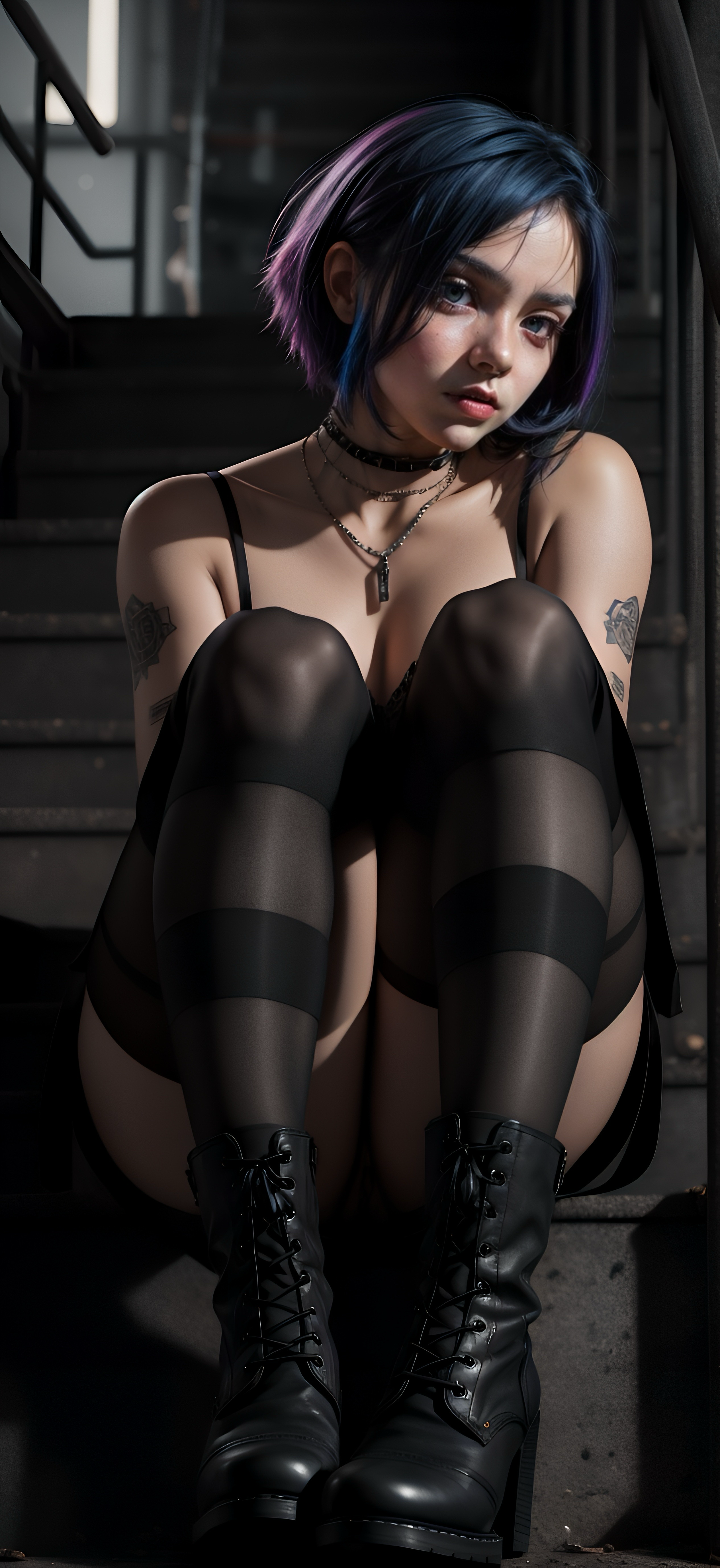 A delicate, vulnerable girl with short black hair sits quietly on the worn steps of an old warehouse staircase. Her slight frame is clad in simple, minimalistic clothes and black leather boots that rest firmly on the step below her. The light from a window casts soft shadows across her pale skin, highlighting her downcast gaze and the subtle melancholy in her expression.