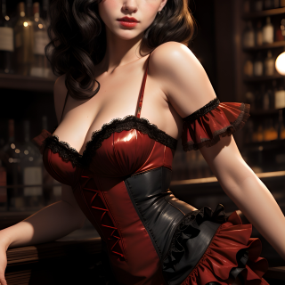 A pretty French girl stands at a bar counter. She has black wavy hair and a sweet face. Her gaze appears innocent, yet her outfit tells a different story. She’s wearing a black-and-red ruffled corset paired with a tutu and black nylon stockings. Truly, she embodies a captivating Lolita.
