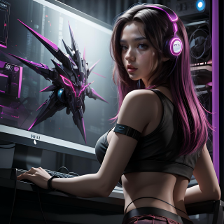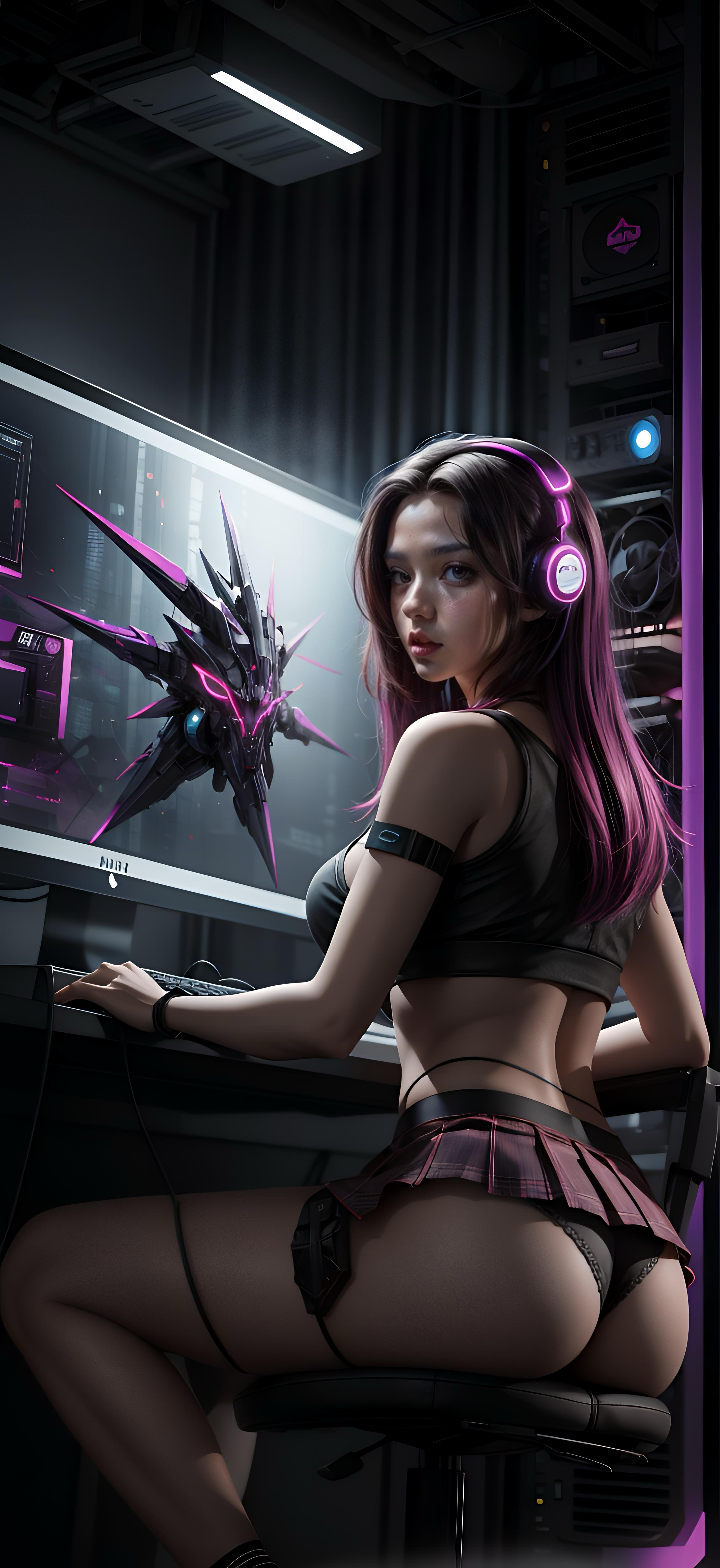 She doesn’t just play the game… she owns it. Every flick of her fingers commands digital destruction, every move calculated with the precision of a lethal machine. Her headset glows with the same hue as her AI companion. She turns, catching you staring at the curve of her exposed delicate booty beneath that dangerously short skirt. She smirks. And your brain whispers: “Let’s play this game, baby.” Then you realize: she’s not here to flirt. She’s here to dominate you. And maybe — just maybe — she’ll let you chase her… if you can keep up.
