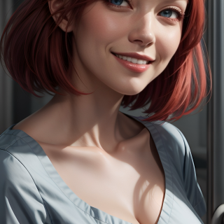 A lovely nurse with short red hair exudes a kind and caring aura. Her striking light blue eyes complement her warm, friendly smile, creating an air of trust and compassion. She has a demeanor that instantly puts people at ease, making her the perfect caregiver for anyone seeking comfort and professional care in her loving hands.