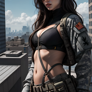 A black-haired sniper girl stands poised on the rooftop of a high-rise building under the bright midday sun. Dressed in military attire with her jacket open, revealing a practical black sports bra beneath, she exudes precision and control. Her sleek sunglasses reflect the sprawling cityscape below as she steadies her rifle, every movement deliberate and calculated. The wind ruffles her hair as she surveys the scene, ready for action.