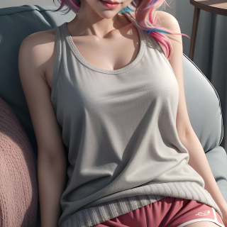 A cute teenage girl is comfortably seated on a cozy sofa. Her hair is dyed in vibrant, playful colors, adding to her charming appearance. She’s dressed in short, comfy sports shorts and a loose tank top, perfect for a relaxed evening. Her casual posture and warm expression suggest she’s waiting for company, ready to enjoy a laid-back and pleasant time.