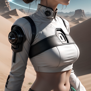 A beautiful black-haired girl sits alone in the golden sands of a desolate alien desert, her twin buns neatly framing her delicate face. Her striking outfit - a tight, white leather crop top and a sleek black leather miniskirt - clings to her, reflecting the intense sunlight that beats down from an alien sky. The strange, otherworldly landscape is silent save for the whisper of the wind, the sand around her glittering faintly under the twin suns of the barren planet. She seems out of place yet resilient, her presence a mix of fragility and quiet strength in this harsh, unforgiving world.