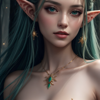 A stunning elven beauty stands with a dreamy gaze in the heart of an enchanting forest. Glowing particles and fireflies float around her, creating an ethereal atmosphere. Dressed in a sparkling green gown, her ultra-long, sleek green hair cascades gracefully, perfectly complementing her magical emerald eyes. She seems to merge with the forest itself, embodying its essence. The mistress of the mystical woods.