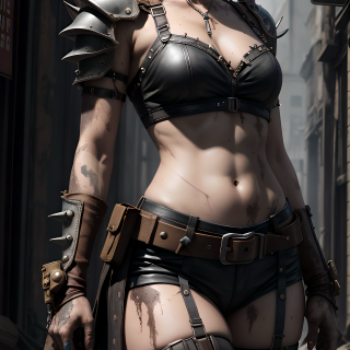 Amidst the ruins of a decayed city, a fierce warrior woman stands tall. Her toned, battle-hardened body adorned with leather and metal. Her sculpted abs glisten under the harsh light, smeared with dirt and remnants of past fights. Clad in a tight, black leather bra with spikes and buckles, she exudes both danger and allure. Her sexy legs, wrapped in straps and holsters, hint at her relentless endurance. With piercing eyes and a determined expression, she is a vision of both beauty and brutality. A survivor, a fighter, and the princess of the wasteland.