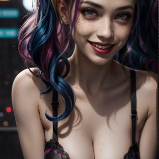 A busty girl with rainbow-colored pigtails, her skin dotted with freckles. She wears a black lace, stylish bra. She's leaning her upper body slightly forward as she gazes in Your eyes with a confident expression. Her posture exudes a sense of playful energy, and her colorful pigtails stand out against her complexion.