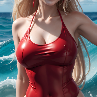 Long golden hair. Big, round breasts. Soft, rounded hips. A picture-perfect bombshell. Waves kissed her thighs, as if the ocean itself couldn’t resist. Her red seduction suit clung to every curve like it had been sculpted just for her. A body that could sink ships. Not through chaos, but through sheer awe. The kind of beauty that didn’t ask for attention… it commanded it. And yet, her expression remained soft. She was temptation wrapped in innocence. The kind of vision that makes even the calmest heart skip… and the wildest mind wander.
