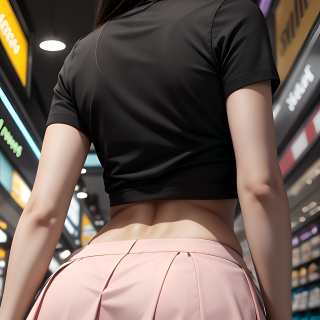 A pretty black-haired girl is out shopping, clearly enjoying herself as she laughs while carrying her shopping bags. She’s dressed in a black top and a daringly short baby-pink pleated skirt. Seen from behind, the skirt is so short that a hint of her booty is visible.