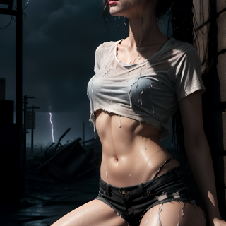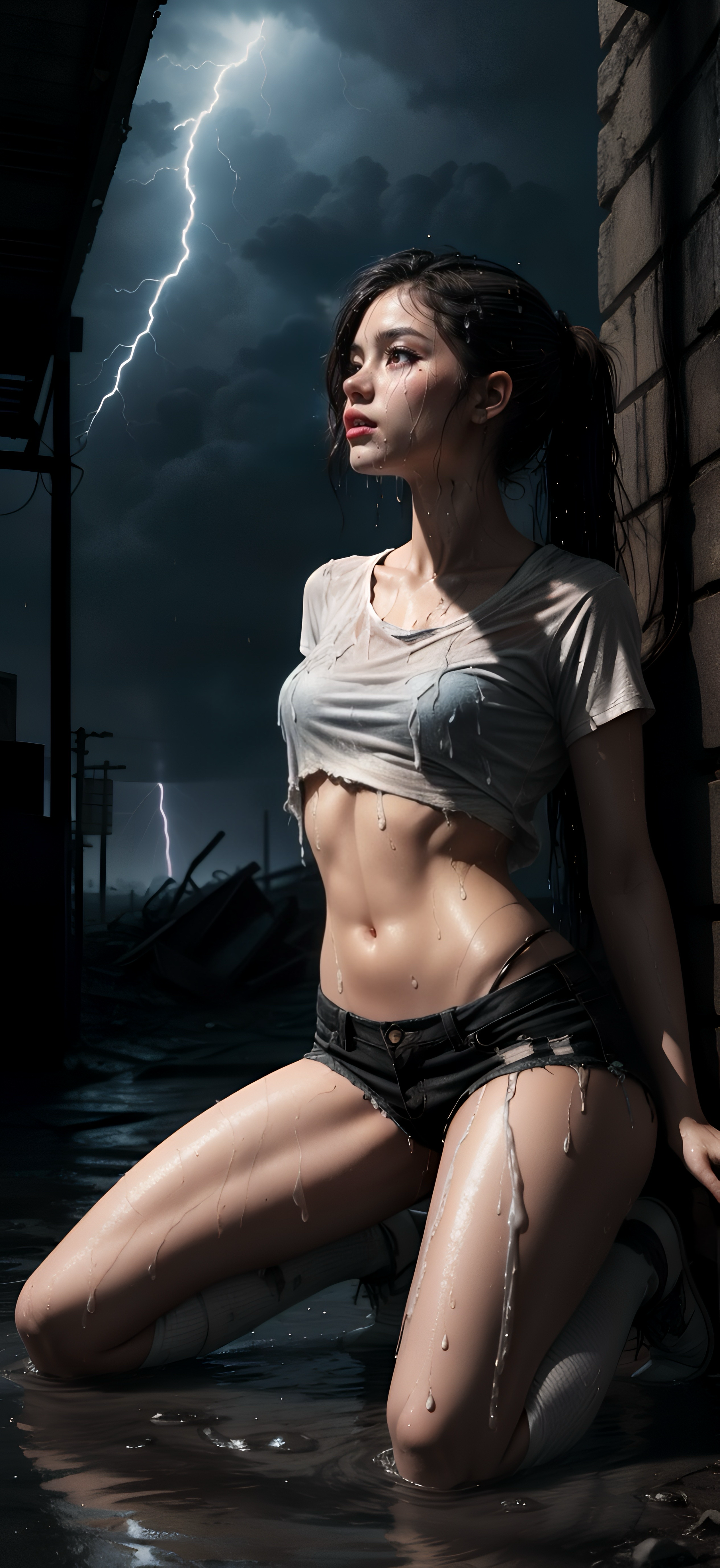 A young Korean girl kneels in the strange, milky rain, her shirt soaked through, clinging to her skin. The storm rages around her, with flashes of lightning illuminating the dark, stormy sky. Her dark hair sticks to her face, and her expression is one of quiet contemplation, as if lost in the intensity of the moment.