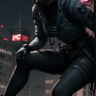 A slender and agile girl with a long black ponytail moves nimbly across the rooftops of a bustling city under the cover of night. She’s clad entirely in black, including skin-tight leggings, leather gloves, and a sleek leather jacket. A black mask conceals her mouth and nose, further aiding her efforts to disappear into the darkness. Her movements are light and precise. Her intent clear: To remain unseen as she blends seamlessly with the shadows of the night. She is a thief, skilled and elusive, navigating the urban landscape with silent determination.